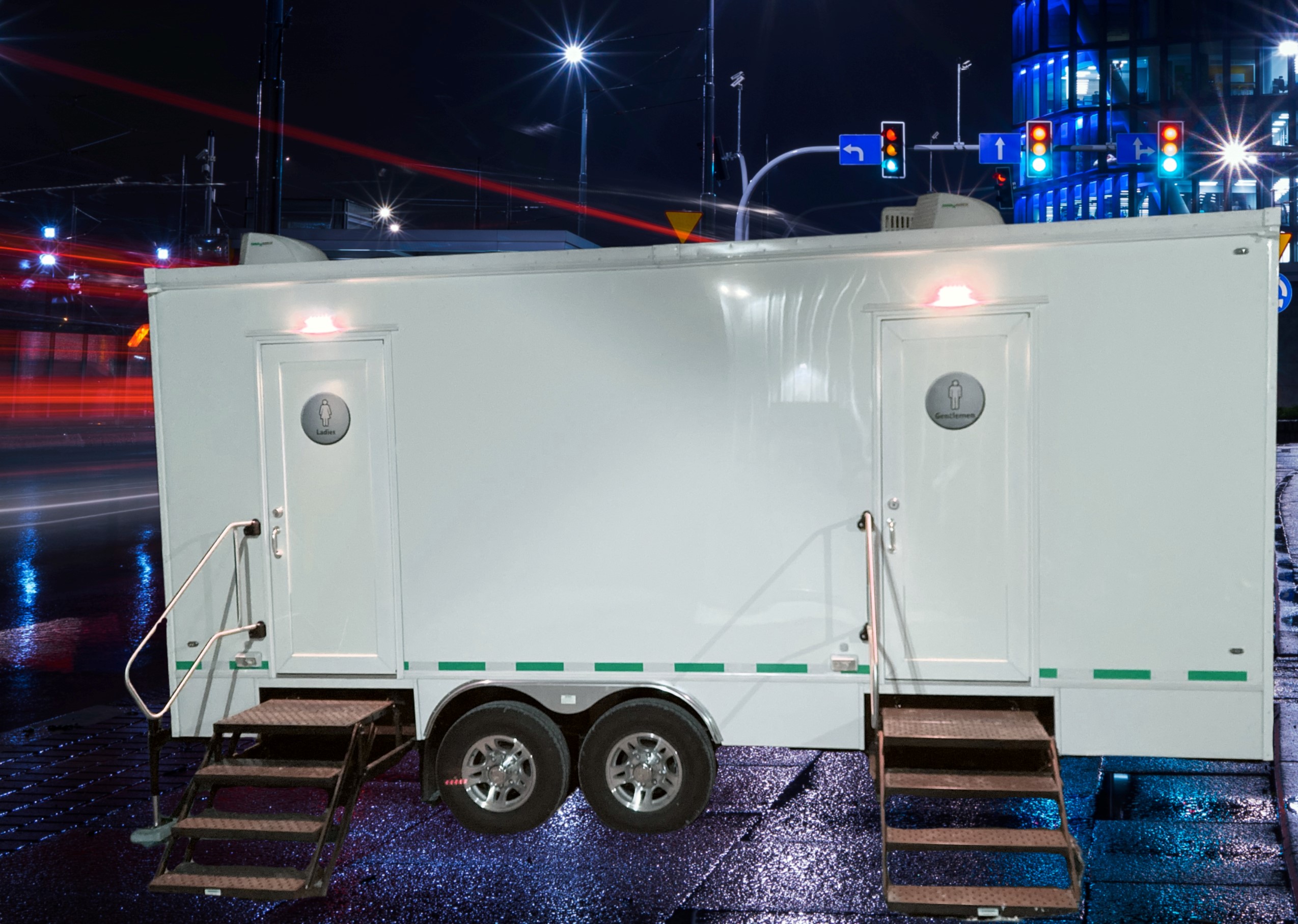 Our two-station mobile restroom trailers have separate entrances for men and women. These upscale portable restroom trailers have sinks with running water, interior and exterior lighting, a full-size mirror, and a premium sound system. They are climate-controlled in order to keep you warm in the winter and cool in the summer. This size is perfect for small weddings, VIP areas, family reunions, or corporate events.