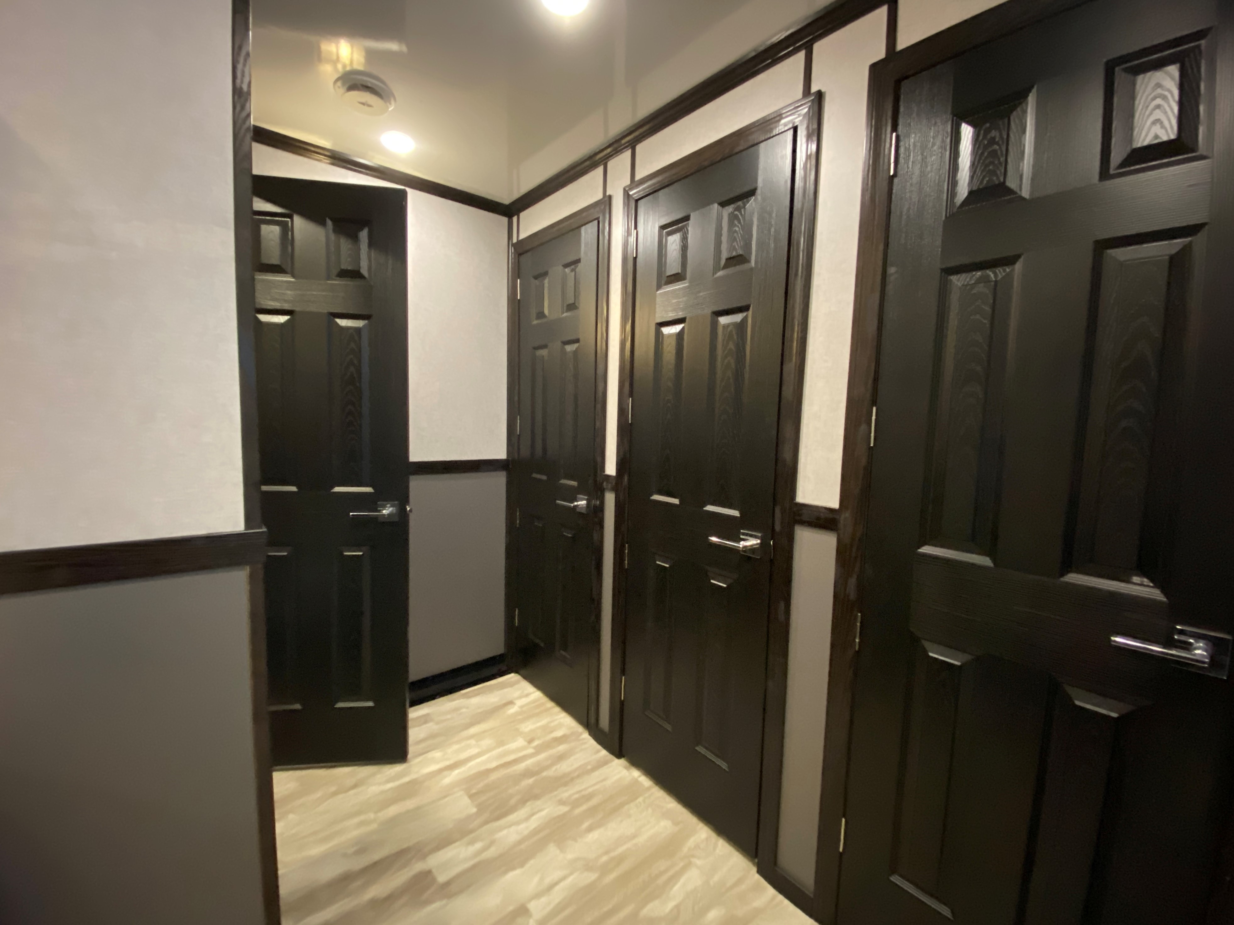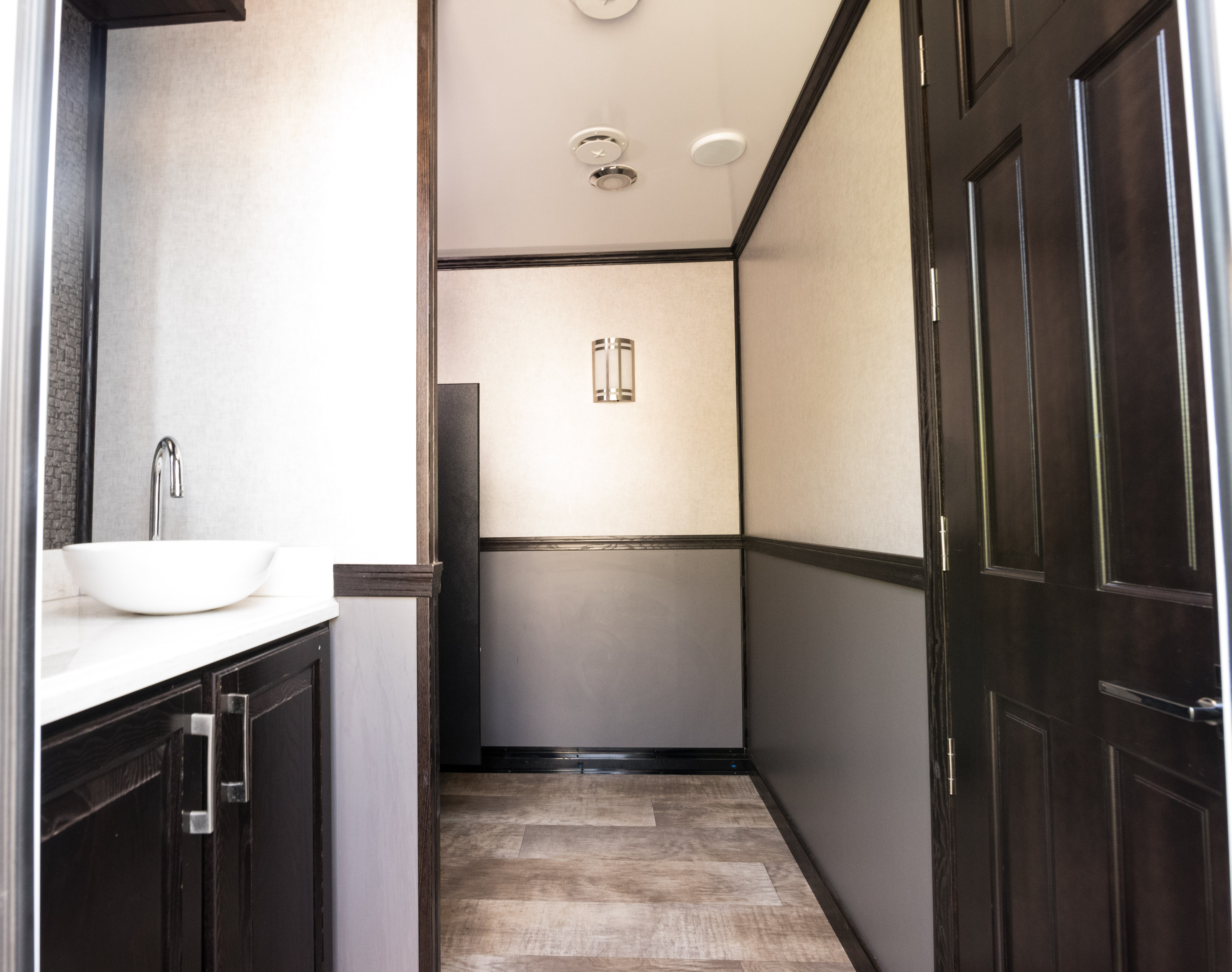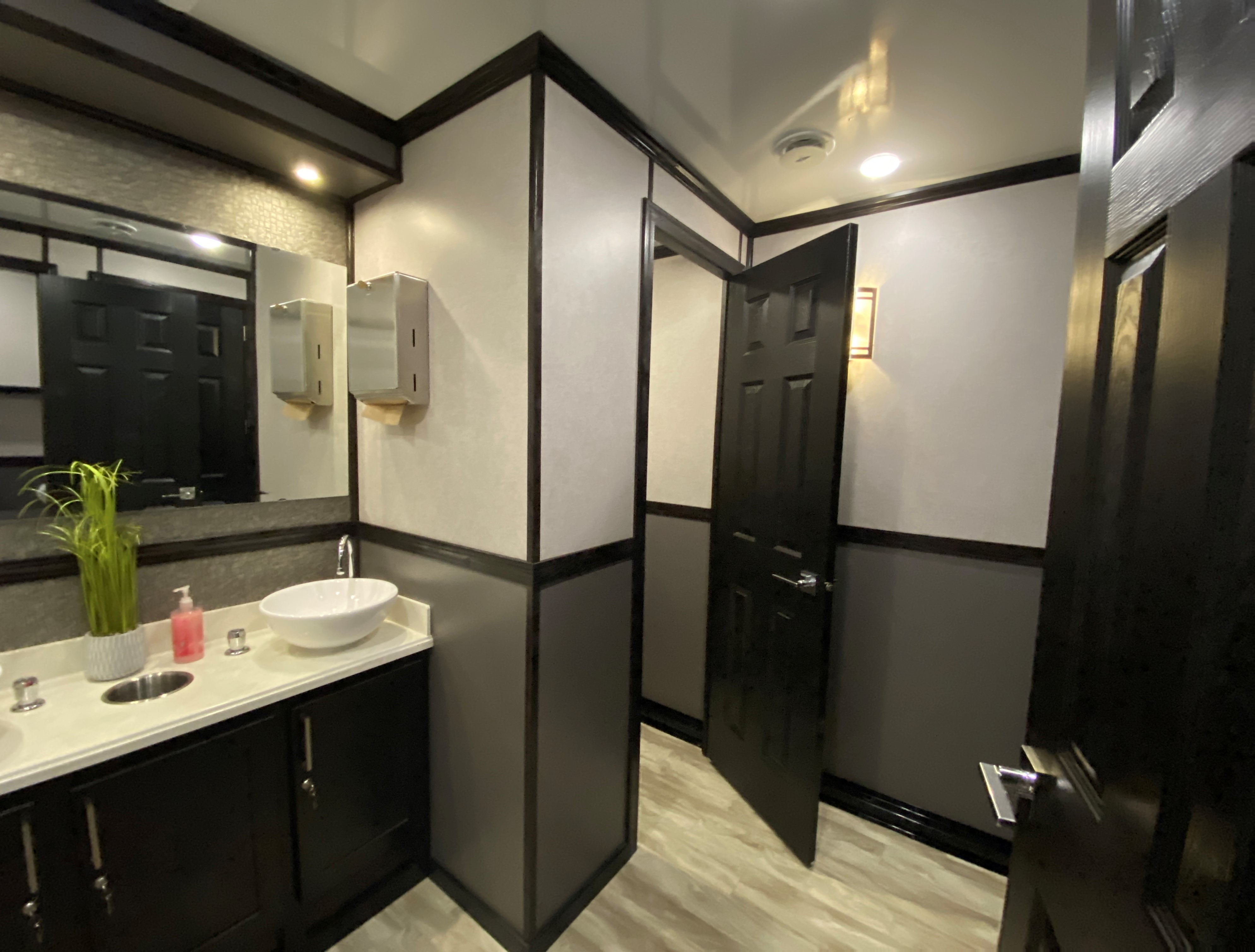 Our eight-station mobile restroom trailer has separate entrances for men and women. It has five stalls on the ladies’ side and two stalls and two urinals on the men’s side. This beautiful 2021 model luxury restroom trailer has upgraded features including stainless steel lighting and solid surface countertops, hardwood cabinets, beveled mirrors, and plank-rolled flooring. This upscale portable restroom is perfect for large weddings, VIP areas, and corporate events.