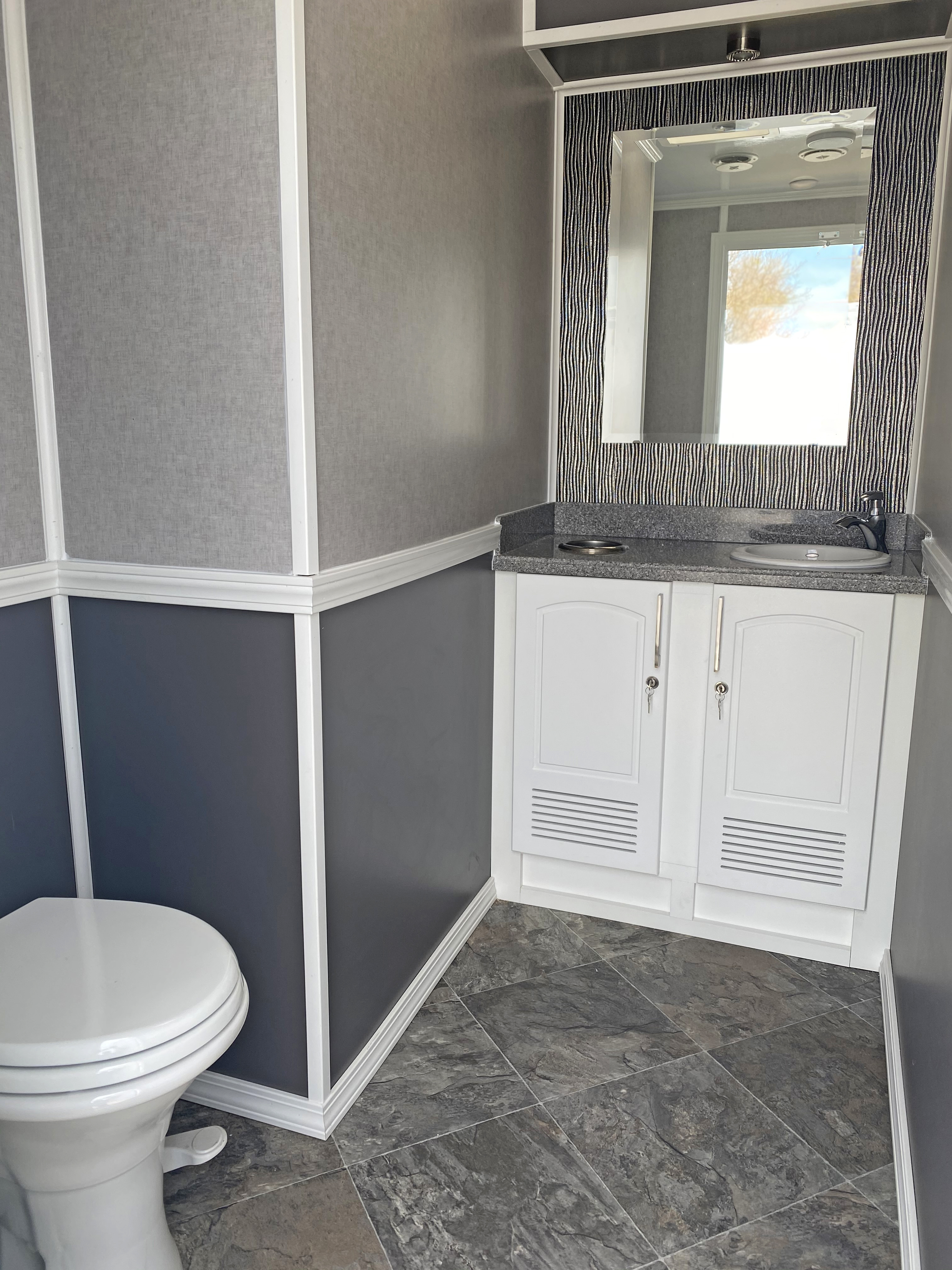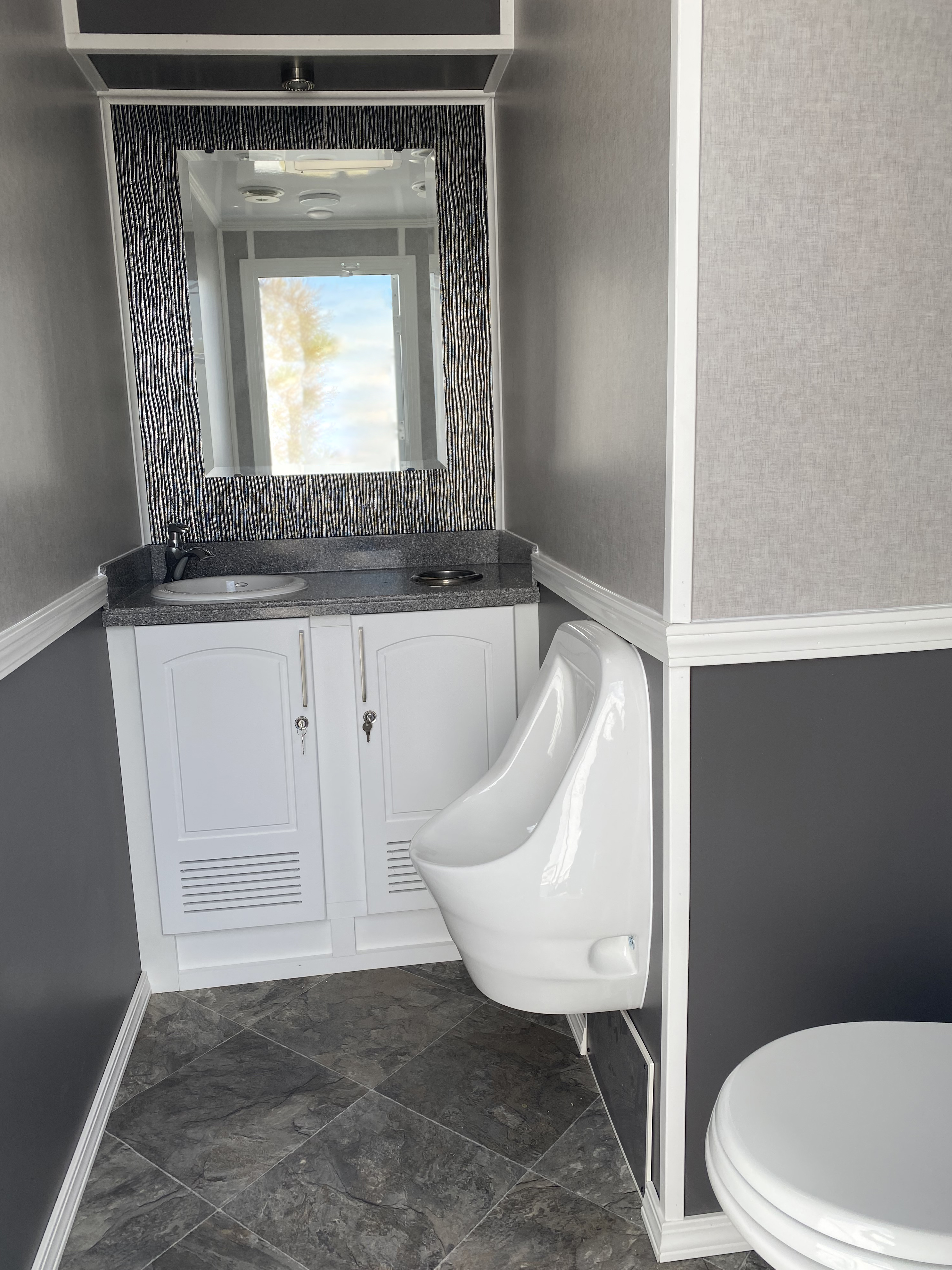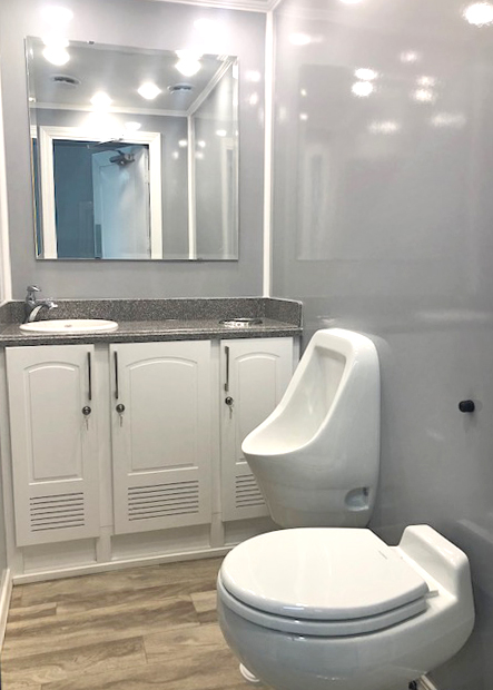 Our eight-station mobile restroom trailer has separate entrances for men and women. It has five stalls on the ladies’ side and two stalls and two urinals on the men’s side. This beautiful 2021 model luxury restroom trailer has upgraded features including stainless steel lighting and solid surface countertops, hardwood cabinets, beveled mirrors, and plank-rolled flooring. This upscale portable restroom is perfect for large weddings, VIP areas, and corporate events.