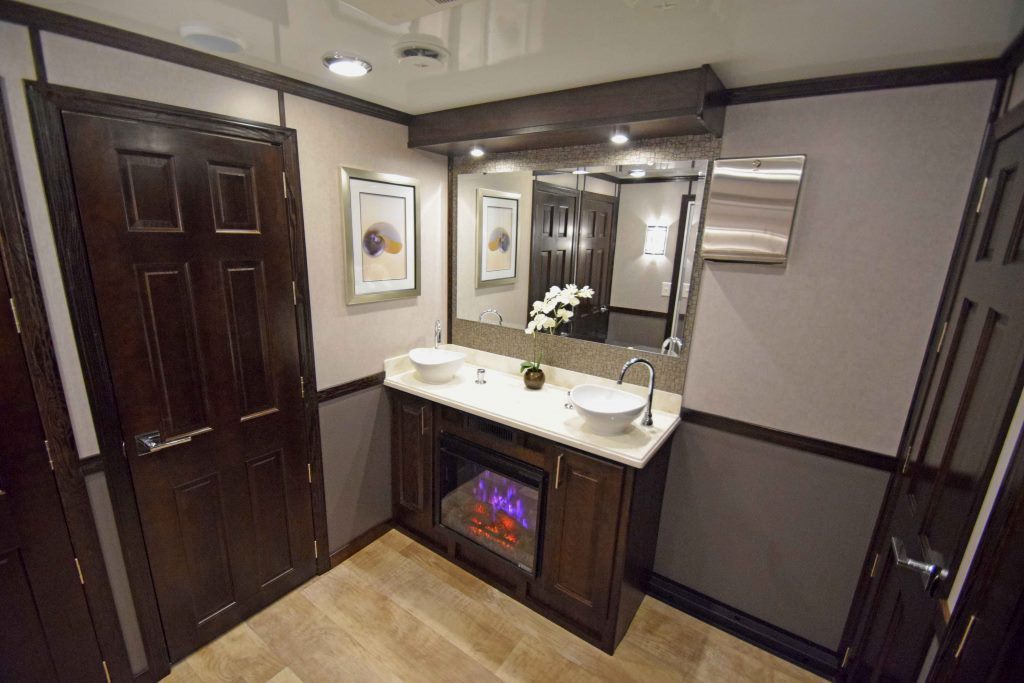 Our seven-station mobile restroom trailer has separate entrances for men and women. It has four stalls on the ladies’ side and three on the men’s side. This beautiful luxury restroom trailer has an electric fireplace heater, upgraded features including stainless steel lighting and solid surface countertops, hardwood cabinets, beveled mirrors, and plank-rolled flooring. This upscale portable restroom is perfect for medium to large weddings, VIP areas, and corporate events.